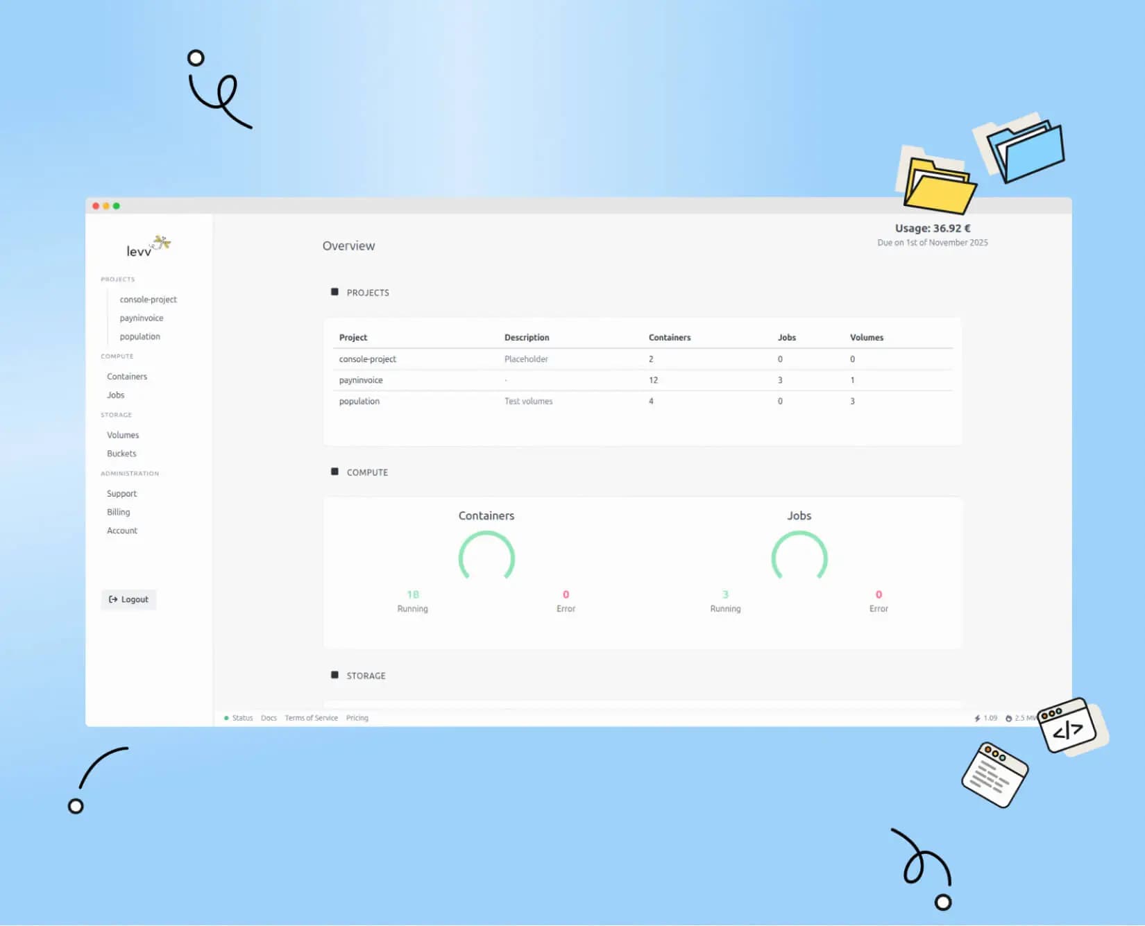 # Deploy your first app $ levv apply -f compose.yaml ✓ Deploying to Brussels... ✓ Container running ✓ Carbon monitoring active